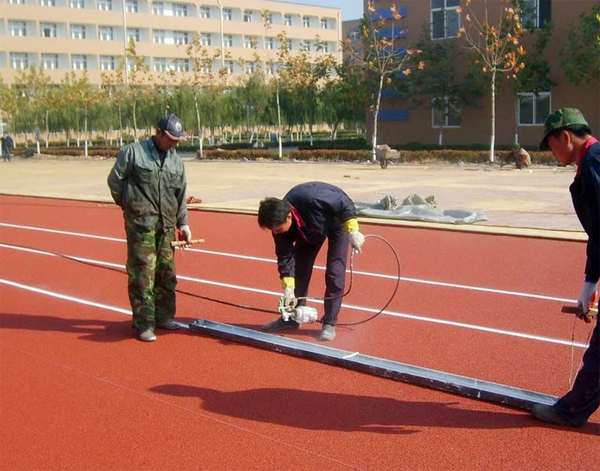 塑膠跑道施工是將甲組分、乙組分混合攪拌—加入催化劑—攪拌成粘稠膠料——加入圓桶攪拌機與黑膠粒攪拌均勻—用運料車運送到現場—攤鋪機鋪設底膠—噴涂表面防滑顆粒—常溫固化—測量、畫線